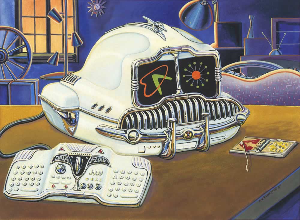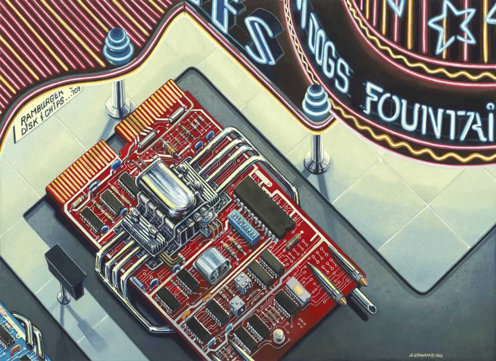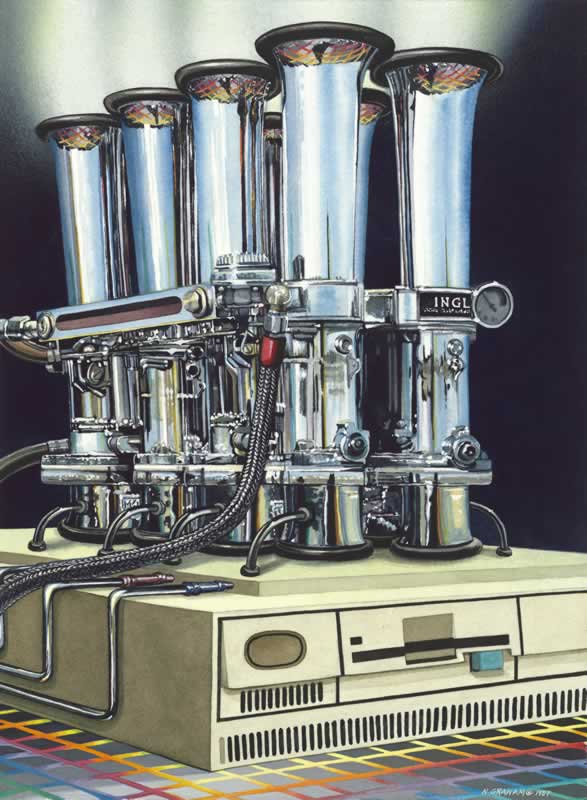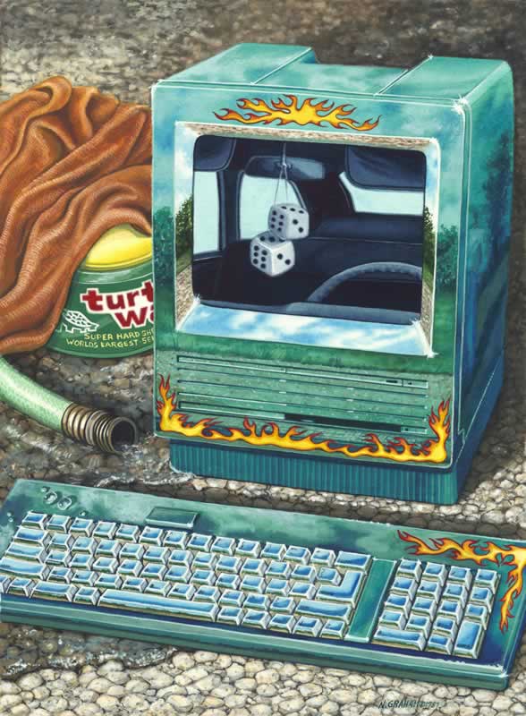 Technology is an irrefutable aspect of everyday life and art is no exception. Nancy offers a technology artworks collection that connects the early days of the emerging power of personal computers with the high performance of American muscle car engines. Some of these pieces were done in collaboration with ideas by Scott Guthrie for Rambenders. Technology art is the integration of engineering, nature, culture, and other features of the world in which we live.