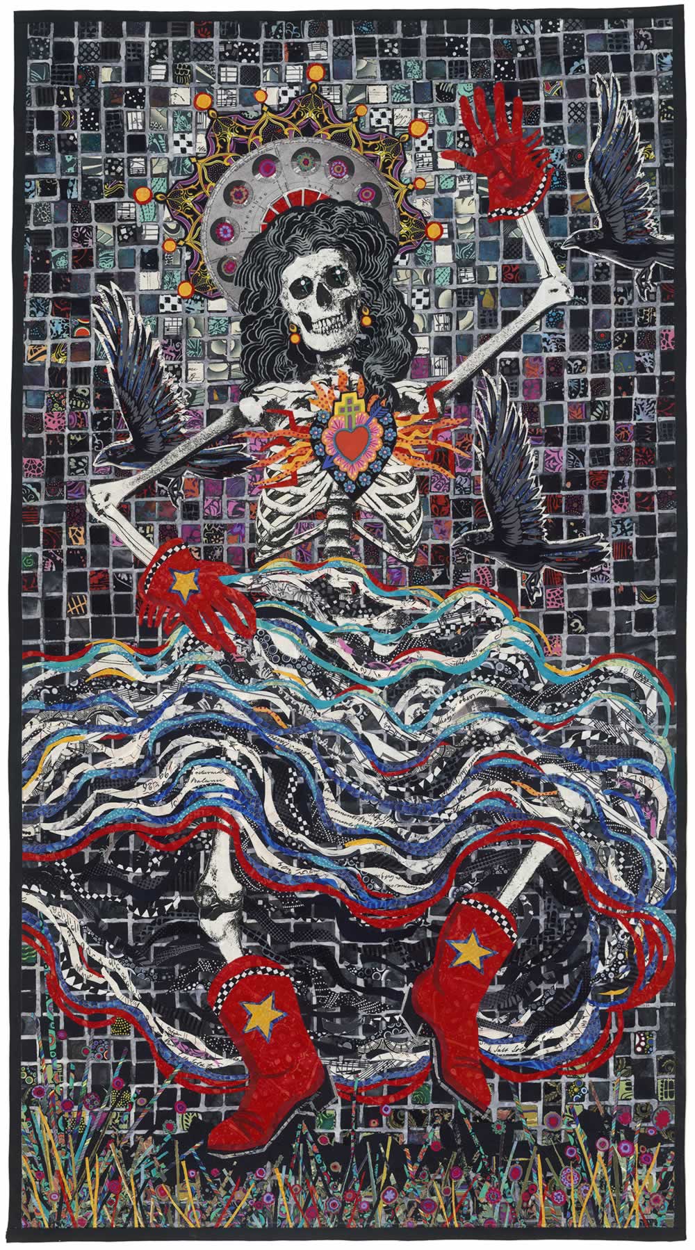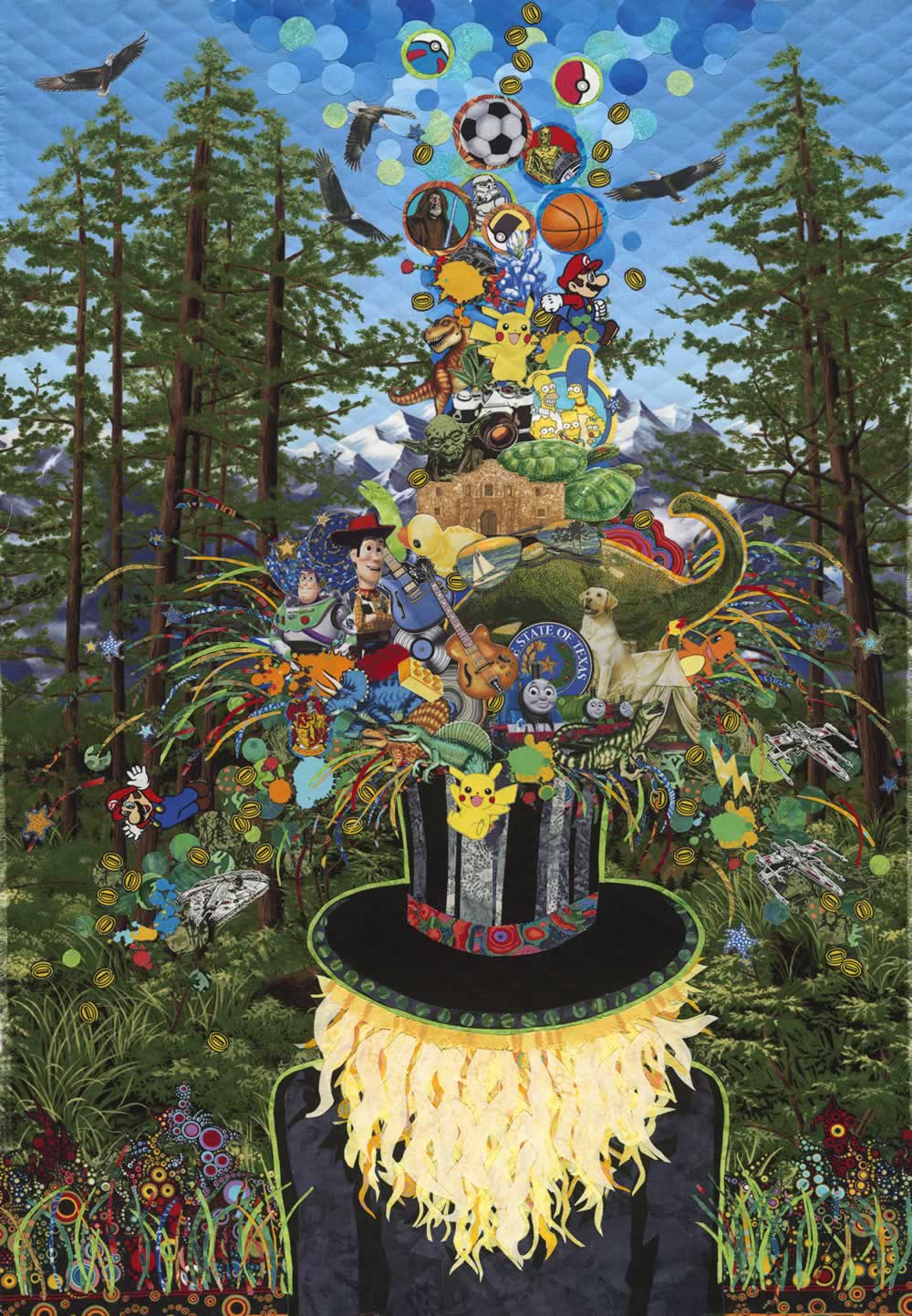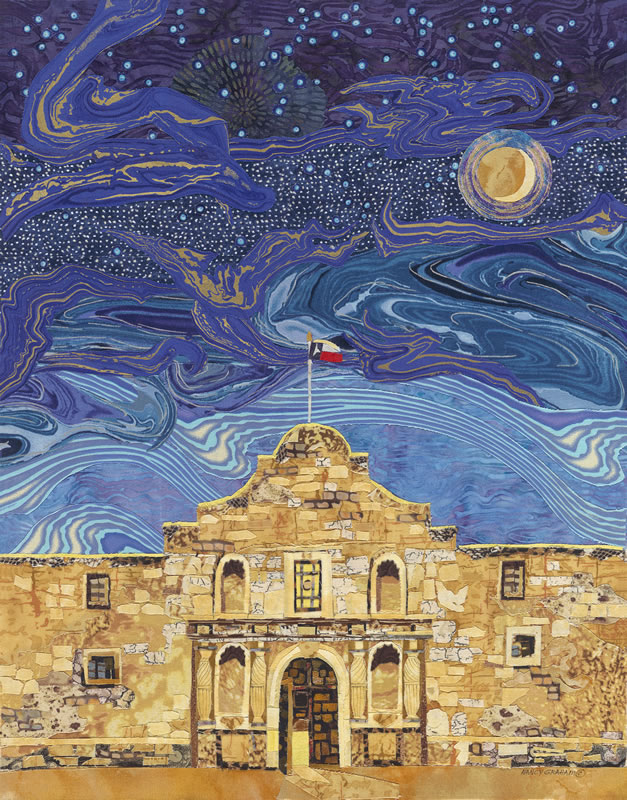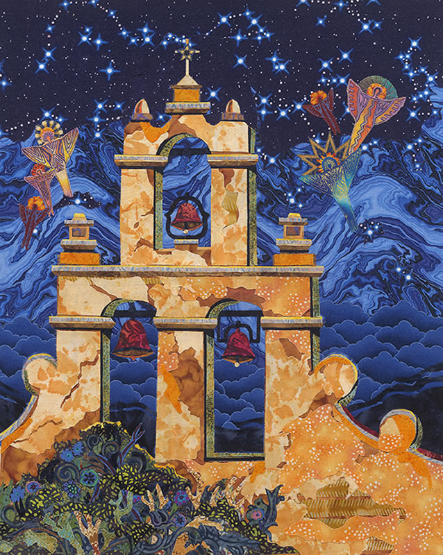 Nancy’s fabric wall art covers a variety of subject matter. Centered around southwestern culture and Nancy’s children, every piece is painstakingly constructed to inspire awe, curiosity, and raw emotion. When creating fabric art, or studio art quilts, Nancy utilizes fusible webbing to attach pieces of fabric to a quilted or canvas base. Once she has an idea in her mind, she goes through her many boxes of fabrics and chooses colors and patterns that work together to create the desired image. The process is similar to creating a paper collage, however, the material is cotton or wool fabric.