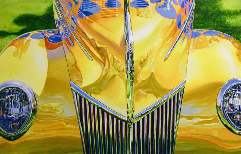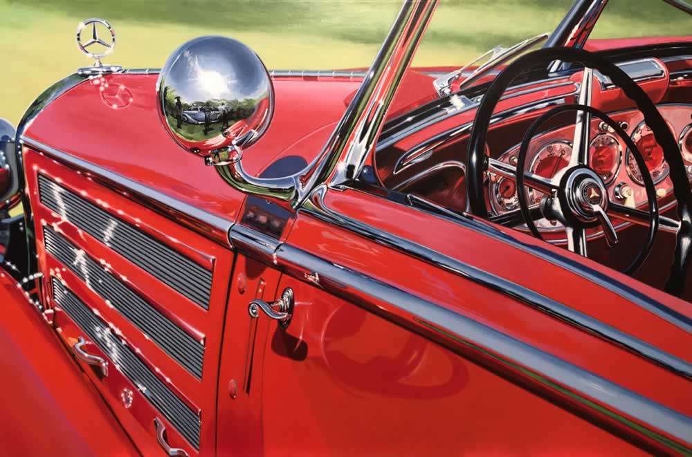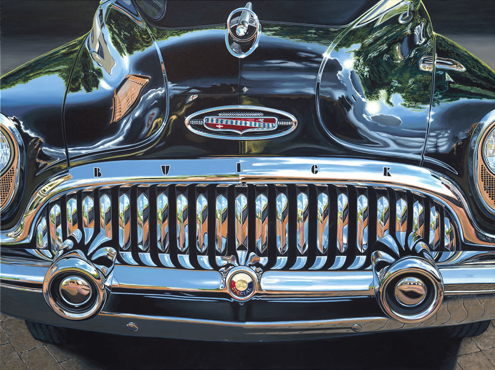 Vintage cars from the 1930s through the 1960s hold a special place in Nancy’s heart. For example, the 1950’s marked the dawn of the sports car and ignited the fiery rivalries we see today. What sets Nancy’s paintings apart from other realistic artists’ paintings is the level of attention to detail she puts into each piece. Her Jaws 2 masterpiece, the subject of which is a 1953 Buick, showcases Nancy’s ability to not only capture the elegance of the classic car, but also places the subject in a real location with meticulous brushwork in the reflection on the grill and hood.
