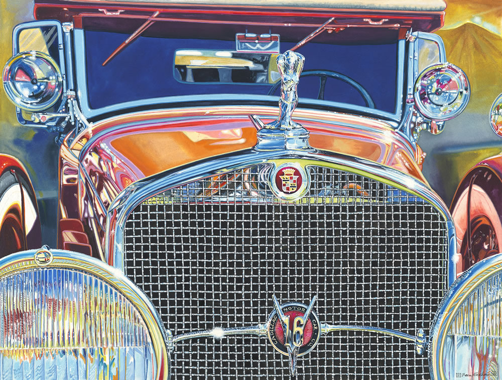 The original paint color on this magnificent V16 was enhanced in Nancy’s work to draw more attention to the reflections, and strengthen the composition. The painstaking work on the mesh grill is a testament to her extraordinary skill.